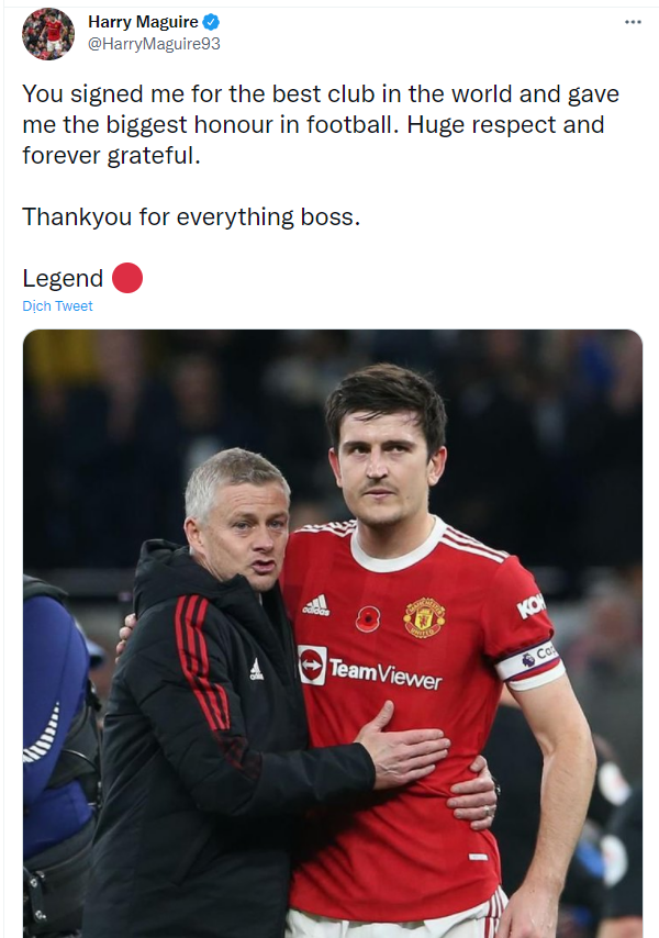 Không quá để nói rằng Maguire là nhân tố lớn nhất khiến Solskjaer bị sa thải. Sau khi biết tin vị HLV người Na Uy bị chấm dứt hợp đồng trước thời hạn, Maguire đã có những chia sẻ qua mạng xã hội: "Thầy đã đưa tôi câu lạc bộ tốt nhất trên thế giới và mang lại cho tôi vinh dự lớn. Xin kính trọng và mãi mãi biết ơn. Cảm ơn thầy vì tất cả mọi thứ. Huyền thoại!"