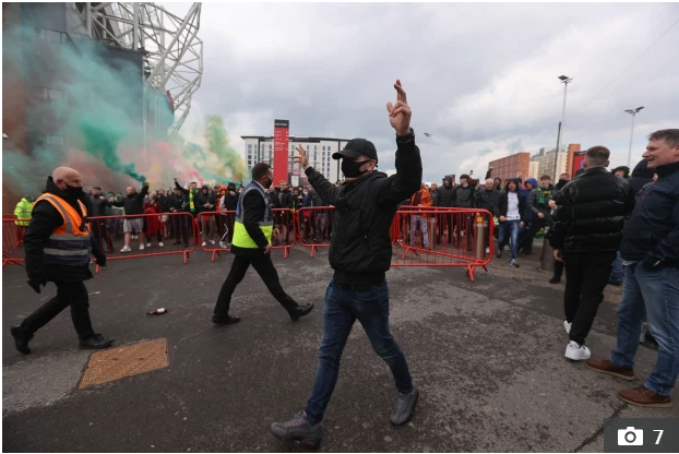 Người hâm mộ MU đã tập trung bên ngoài khách sạn Lowry nơi MU đang đóng quân, họ vây quanh xe buýt chở các thành viên của Quỷ đỏ tới sân Old Trafford. Những CĐV này hô vang những khẩu hiệu phản đối nhà Glazer, họ đốt pháo sáng và thậm chí va chạm với cảnh sát.