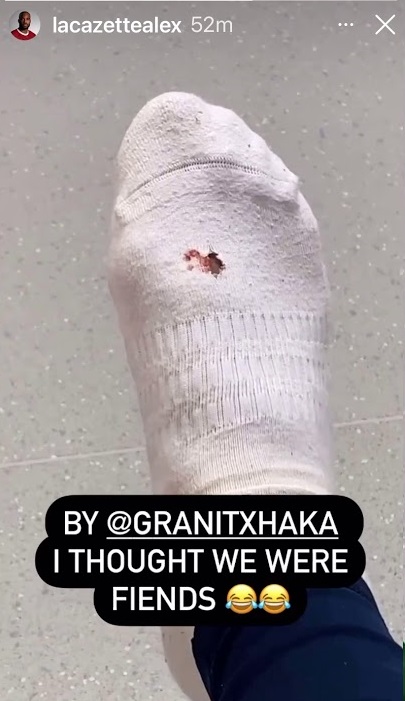 Mới đây, Lacazette đăng trên trang cá nhân tấm ảnh bàn chân với chiếc tất dính máu. Anh để lại dòng trạng thái: "Do Xhaka làm đấy. Tôi vẫn tưởng chúng ta là bạn cơ!" kèm biểu tượng cảm xúc cười ra nước mắt.