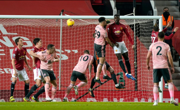 Đội trưởng MU nhảy lên tranh bóng và va chạm với thủ môn Sheffield United. Tuy nhiên, tình huống tranh chấp 50-50 này bị coi là phạm lỗi nên bàn thắng của tiền đạo người Pháp bị hủy bỏ.
