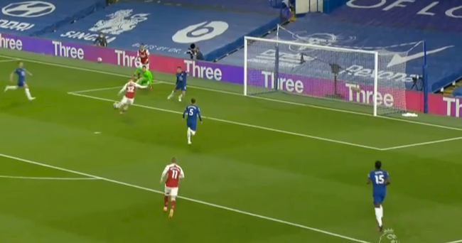Phút 16 trong trận đấu giữa Chelsea và Arsenal ở vòng 36 Ngoại hạng Anh, tiền vệ Jorginho có tình huống chuyền bóng về cho thủ môn Kepa khi bị đối phương áp sát. Tuy nhiên, thủ thành người Tây Ban Nha đã ở khá xa khung thành, anh nỗ lực băng về để tránh cho đồng đội đá phản lưới nhà bằng tình huống cản phá ngay trên vạch vôi.