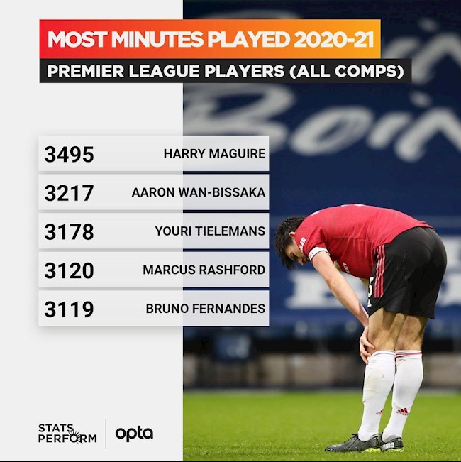 Theo thống kê từ Opta, Maguire dẫn đầu danh sách 5 cầu thủ đang chơi bóng tại Premier League mà có số phút thi đấu nhiều nhất tính trên mọi đấu trường từ đầu mùa 2020/21: lên tới 3495 phút.