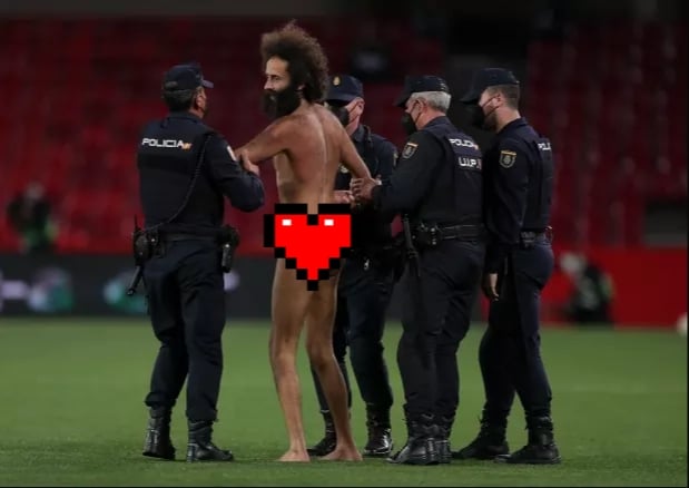 Phút 6 trong trận đấu giữa Granada vs MU ở lượt đi tứ kết Europa League 2020/21, khi MU đang tiến hành phản công, một người đàn ông không mặc gì đã đột ngột chạy vào sân khiến trận đấu bị gián đoạn. Thành viên của 2 đội và tổ trọng tài đều bất ngờ với vị khách không mời mà đến.