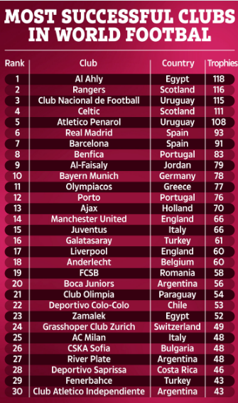 Theo thống kê, Rangers là đội bóng thành công thứ 2 thế giới. Trong lịch sử của mình, đội bóng của Scotland đã giành tổng cộng 116 danh hiệu lớn nhỏ, chỉ xếp sau đội bóng Al Ahly của Ai Cập (118 danh hiệu).