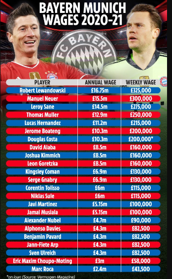 Xếp thứ 2 tại Bayern Munich về khoản lương bổng là thủ môn Manuel Neuer, người vừa gia hạn hợp đồng đến năm 2023 và nhận 300.000 bảng/tuần (15.5 triệu bảng/mùa). Leroy Sane đứng thứ thứ 3: 275.000 bảng/tuần (14.5 triệu bảng/mùa).