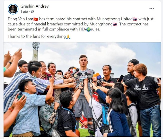 Trên trang cá nhân, người đại diện của Văn Lâm, Grushin Andrey thông báo thủ môn Việt kiều và Muangthong Utd đã chấm dứt hợp đồng. Lý do bởi đội bóng Thái Lan vi phạm những quy định về tài chính trong hợp đồng. Do đó, cả hai bên đường ai nấy đi theo đúng quy định của FIFA.