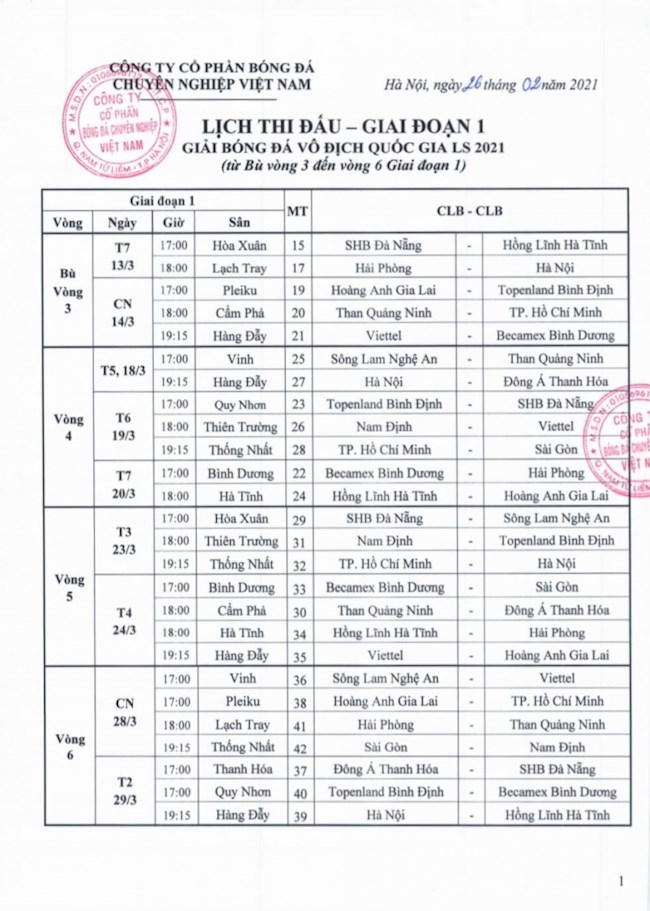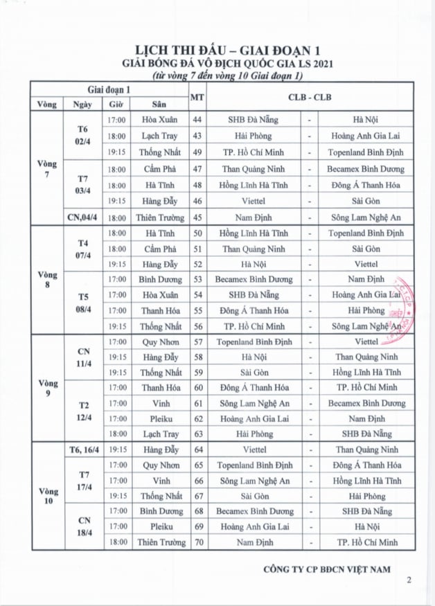 Ngoài ra, VPF cũng công bố lịch thi đấu tới hết vòng 10 giai đoạn 1 V.League 2021. Dễ dàng nhận thấy mật độ thi đấu vô cùng khốc liệt. Các đội bóng đều phải thi đấu tần suất khoảng 4 tới 5 ngày/ trận.