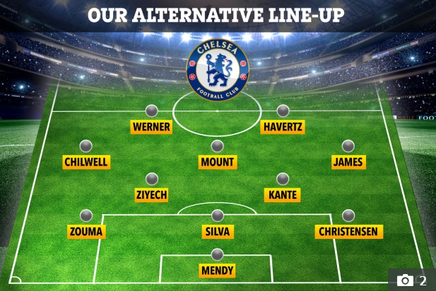 Ở tuyến giữa, để tăng cường khả năng sáng tạo, Kante có thể đá cặp với Hakim Ziyech. Ở vị trí chạy cánh phải, Reece James với tốc độ tốt hơn có thể thay thế Cesar Azpilicueta. Ở hàng thủ, Kurt Zouma có thể thay thế vị trí của Antonio Rudiger – người đang dính chấn thương nhẹ để chơi bên cạnh Thiago Silva, và Andreas Christensen.