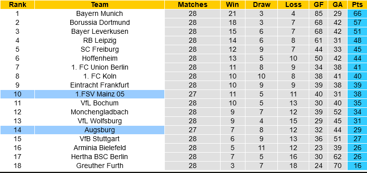 Thêm một chi tiết ủng hộ đội chủ nhà: thắng 7/10 lần chạm trán mới nhất với Mainz. Trong đó, tại tổ ấm Augsburg đã khiến đối thủ phải ra về trắng tay sau 4 lần hành quân gần nhất tính tại Bundesliga.