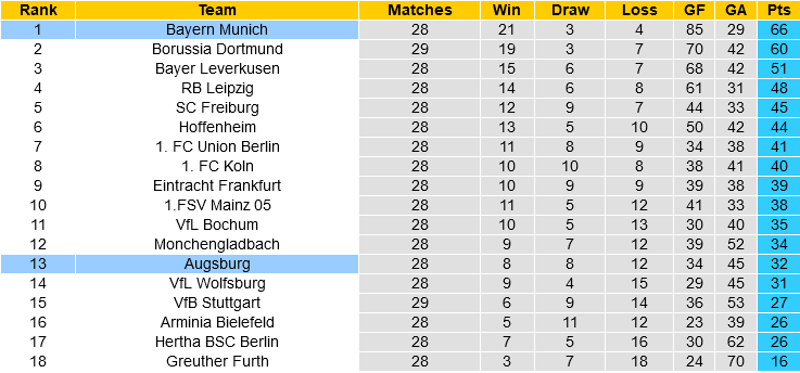Phía bên kia chiến tuyến, Augsburg chưa chính thức trụ hạng dù cơ hội là rất lớn bởi hơn khu vực nguy hiểm tới 6 điểm mà mùa giải chỉ còn 6 vòng. Thêm nữa thầy trò HLV Weinzierl còn đang thi đấu khá khởi sắc thời gian gần đây: thắng 3/5 trận (thua 1).
