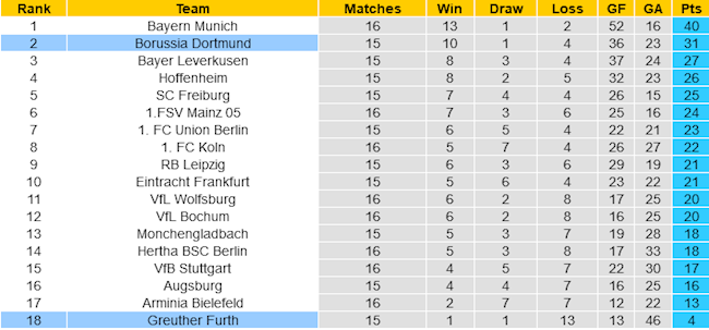 Trong đó, Greuther Furth toàn thua 8 chuyến hành quân gần đây mà gần nhất là thất bại kinh hoàng 1-7 trên sân của Leverkusen. Một đội bóng kém tên tuổi như Greuther Furth hiển nhiên cũng không phải đối thủ xứng tầm với Dortmund. Ở lần gần nhất Greuther Furth được chung hạng Bundesliga với Dortmund (2012/13), họ đã thua cách biệt cả 2 lượt trận đối đầu (1-3 trên sân khách và tới 1-6 trên sân nhà).