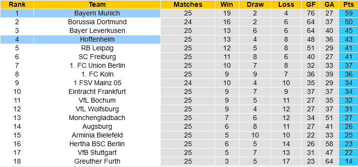 Trong khi đó, Bayern đã thua 3/5 lần làm khách vừa qua của Hoffenheim. Nhưng đổi lại, gã khổng lồ xứ Bavaria đã đè bẹp đối thủ này trong cả 2 lần gặp gỡ gần đây (4-0 và 4-1 đều trên sân của Bayern). Phong độ của Bayern tại Bundesliga thời điểm này không mấy ổn định: thua 2/8 vòng kể từ đầu năm 2022.