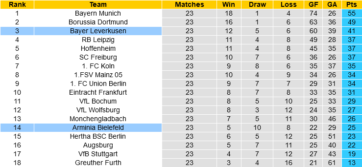 Hiện tại, thầy trò HLV Gerardo Seoane vẫn duy trì vị trí thứ 3 trên BXH với 41 điểm sau 23 trận và cơ hội cạnh tranh chức vô địch chỉ tồn tại về mặt lý thuyệt bởi khoảng cách với đội đầu bảng Bayern Munich lên tới 14 điểm. Trong khi đó nhóm bám đuổi phía sau chỉ ít hơn Leverkusen 4 điểm nên đội chủ sân BayArena mà chỉ sảy chân vài vòng thì nguy cơ rớt khỏi Top 4 là cực cao.