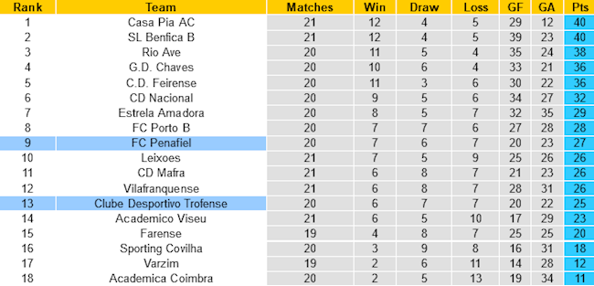 Phía đối diện, Trofense hiện tại mới chỉ có được 25 điểm sau 13 vòng, trên 2 bậc so với khu vực cầm đèn đỏ cùng khoảng cách 7 điểm. Tuy nhiên phong độ của thầy trò HLV Francisco Chalo thời gian gần đây lại có tín hiệu khởi sắc: thắng 1 và hòa 1 ở 2 vòng vừa qua tại giải hạng 2. Trên sân khách Trofense kiếm được điểm ở 3/4 trận gần nhất (thắng 2).