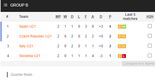 Dù chưa chính thức giành quyền đi tiếp nhưng rõ ràng cửa vượt qua vòng bảng của U21 Tây Ban Nha là rộng nhất bởi họ đã có 4 điểm trước lượt trận cuối, hơn đội thứ 3 khoảng cách 2 điểm (hai đội dẫn đầu sẽ lọt vào vòng tứ kết).
