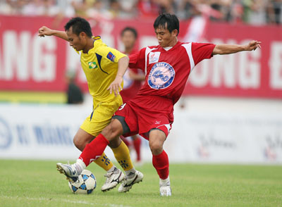 XM.HP (phải) cản bước SLNA trong việc bám đuổi với đội đầu BXH