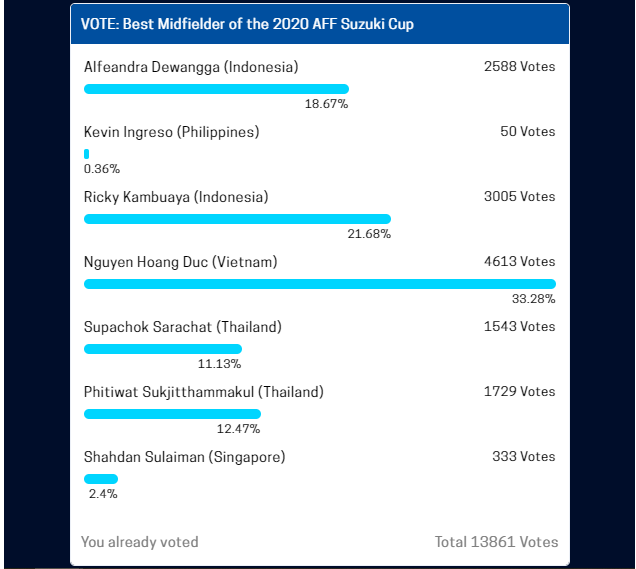 Tính đến 8h45 ngày 1/1/2022, tiền vệ của ĐT Việt Nam dẫn đầu danh sách bình chọn với 4585 lượt vote (33,34%). Xếp sau Hoàng Đức là Ricky Kambuaya và Dewangga của Indonesia với lần lượt 2979 và 2562 lượt bình chọn.