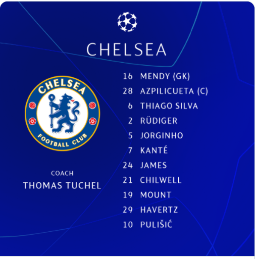 Chelsea: 16 E. Mendy, 6 Thiago Silva, 28 Azpilicueta, 2 A. Rudiger, 21 B. Chilwell, 24 R. James, 5 Jorginho, 7 N. Kante, 19 M. Mount (Ziyech, 86'), 10 C. Pulisic, 29 K. Havertz (Giroud, 90+2)