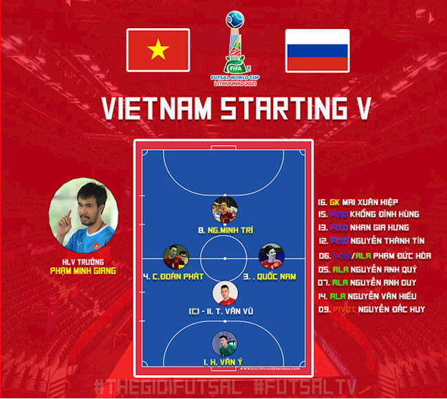 HLV Phạm Minh Giang lựa chọn 5 cầu thủ đá chính gồm Hồ Văn Ý, Trần Văn Vũ, Châu Đoàn Phát, Nguyễn Quốc Nam và Nguyễn Minh Trí. Tuyển Nga xuất phát với những cái tên Dmitri Putilov, Robinho, Ivan Chrishkala, Danil Davydov, Andrei Afanasev.