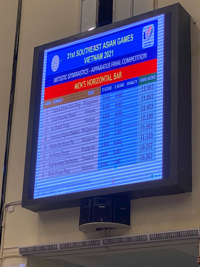 - TẤM HCV QUÝ GIÁ TỪ MÔN TDDC: Tại nội dung xà kép, VĐV Đinh Phương Thành đã vượt qua ngôi sao Carlos Yulo (Philippines) để giành HCV. Đây thực sự là một chiến tích đáng khen vì Yulo là VĐV số 1 khu vực ở môn TDDC và đã giành vài tấm HCV SEA Games lần này. Riêng Đinh Phương Thành đã có tấm HCV SEA Games thứ 10 trong sự nghiệp. Như vậy, TTVN đã có tổng cộng 81 HCV SEA Games 31.