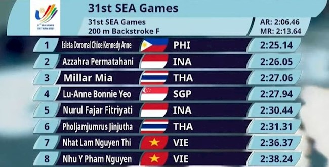 - Hai VĐV Việt Nam là Đặng Ái Mỹ và Trần Thị Hồng Gấm đã vượt qua vòng loại bơi 200m tự do nữ nhưng có lẽ với thành tích vòng loại chỉ đứng thứ 5 và thứ 6 trong số 8 VĐV thi chung kết thì xem ra khả năng tranh chấp huy chương không cao.