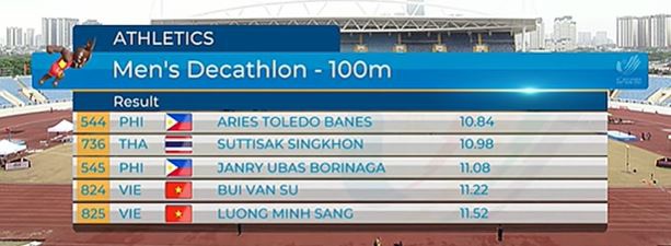 - Tại bài thi đầu tiên (chạy 100 m) của 10 môn phối hợp (điền kinh), VĐV của Việt Nam, Bùi Văn Sự và Lương Minh Sang chỉ có thành tích xếp thứ 5 và thứ 6 trong số 6 VĐV tham dự nội dung vất vả nhất của môn điền kinh.