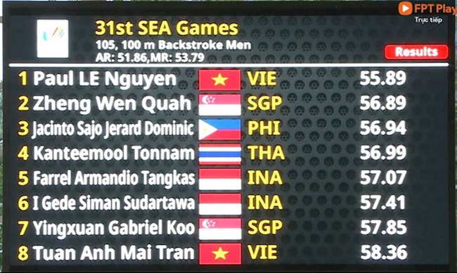 - Tại chung kết nội dung 100m ngửa nam môn bơi lội, kình ngư Lê Nguyễn Paul đã chạm đích với thành tích 56 giây 08, chậm 1 giây 25 so với Quah Zheng Wen - VĐV của Singapore đoạt HC vàng với 54 giây 83. Kỷ lục SEA Games ở nội dung này là 53 giây 79 do chính Quah Zheng Wen lập tại Philippines năm 2019.