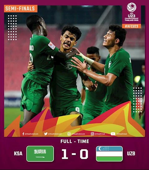 HẾT GIỜ. Dù sao chiến thắng 1-0 là quá đủ để đưa U23 Saudi Arabia vào chung kết U23 châu Á 2020 đồng nghĩa sở hữu luôn một tấm vé tham dự Olympic 2020 còn U23 Uzbekistan trở thành nhà cựu vô địch nhưng còn cơ hội giành vé dự Olympic thông qua trận tranh hạng 3 với đội thua ở trận bán kết còn lại giữa U23 Hàn Quốc vs U23 Australia.