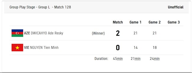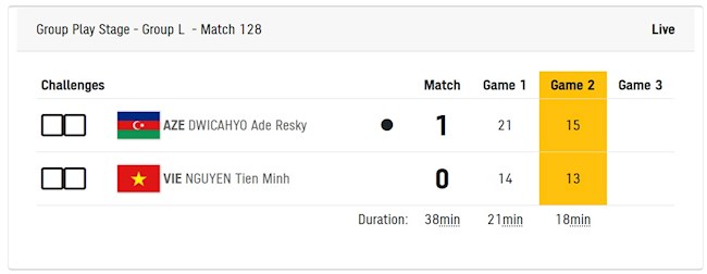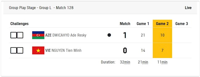 18h50: Tiến Minh đã để thua trong set đấu đầu tiên trước VĐV người Azerbaijan Dwicahyo Ade Reskyvới tỷ số 14-21.